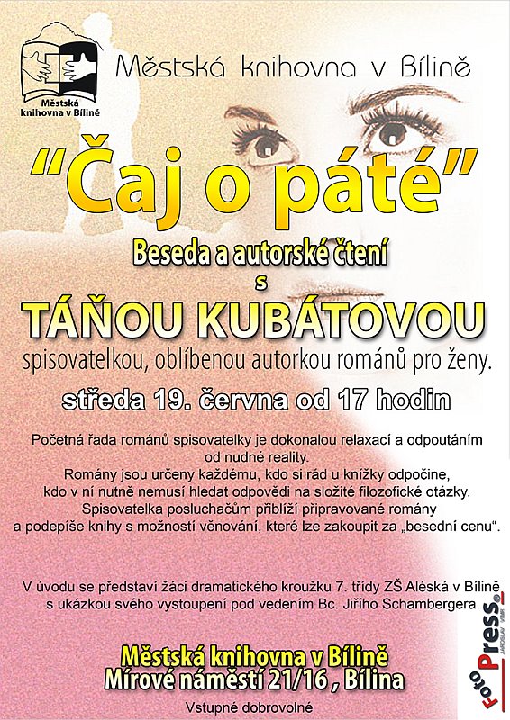 Všechny z Bíliny a okolí srdečně zvu do knihovny na besedu, která se bude konat 19. června v 17:00 hodin.