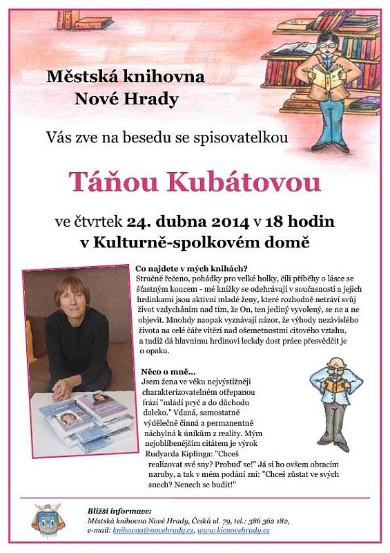 Beseda se bude konat v knihovně v 17:00 hodin. Těším se na setkání s Vámi.